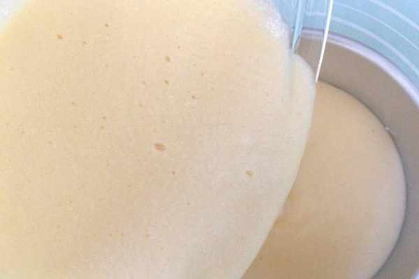 第五步:去三分之一的蛋白霜倒入蛋黃糊中,用橡膠刮刀翻拌均勻,註意翻拌的手法,不用來回畫圈的攪拌,要用刮刀翻拌。
