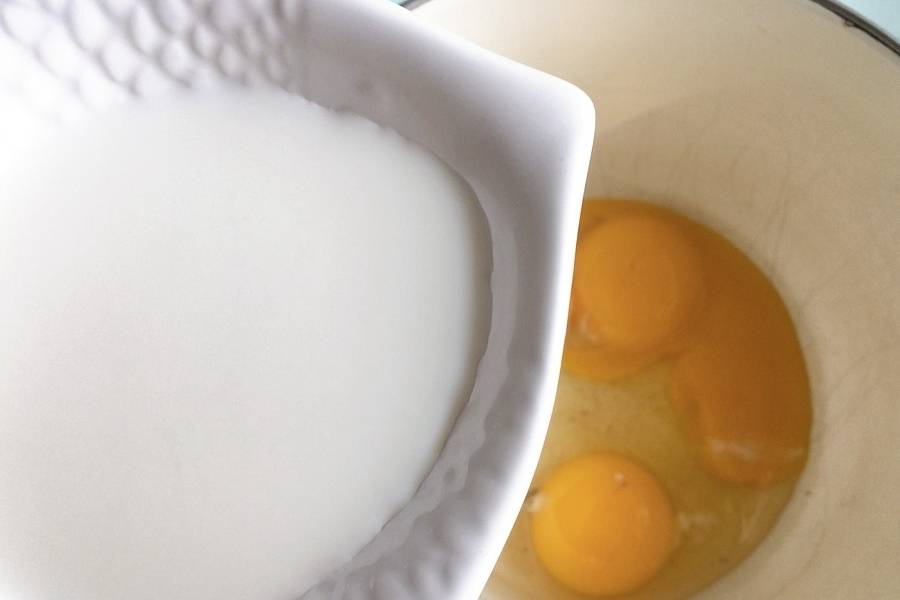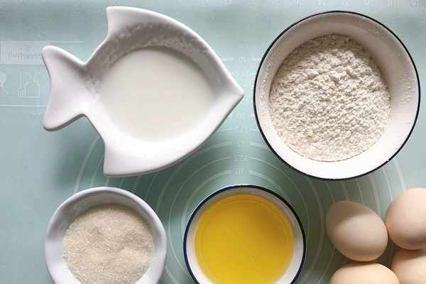 第一步:將3個雞蛋的蛋清和蛋黃分別打入兩個打蛋盆中,再將另一個全蛋打入蛋黃中並倒入50克牛奶,攪拌均勻。