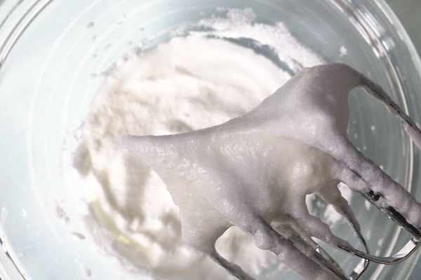 第四步:在蛋清中加入2滴白醋或檸檬汁取出蛋腥味,用打蛋器低速打發10秒鐘,當生成大氣泡時,加入15克白糖再次打發1分鐘,當打至蛋白細膩時在加入10克白糖,再次打發1分鐘,當蛋白打至成霜出現紋路時,加入最後的10克白糖,打發10秒左右,當蛋白霜可以在蛋抽上行程一個小尖時,蛋白打發就打發完成瞭。
