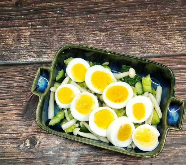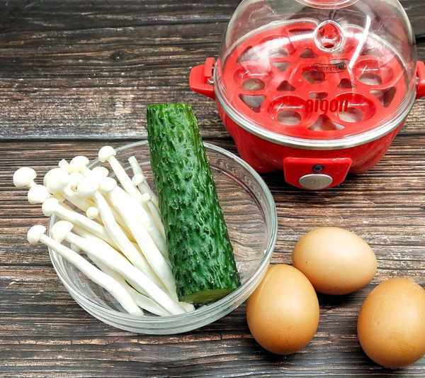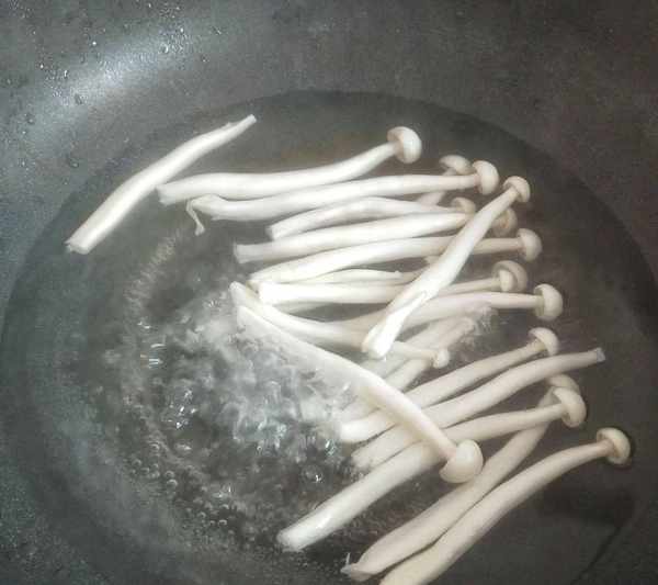 2、食材選擇好之後就開始處理,雞蛋煮熟,然後把清洗好的蟹味菇,也放在水裡面焯水斷生,時間不用太長,大約是兩分鐘左右,時間太長會影響食材的口感。這裡也要註意一下,如果多種食材焯水,本著風味濃後焯水的原則,避免食材相互掩蓋串味的現象發生。