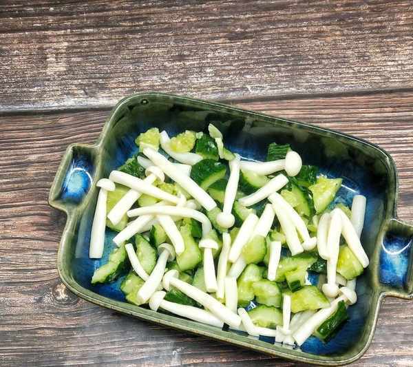 3、除瞭焯水的食材,剩下的像是黃瓜處理就很簡單來瞭,拍散之後切成小段就可以瞭,然後加入自己準備好的食材,還是和平常做涼菜是一個樣子,放在一起,攪拌均勻就可以瞭。