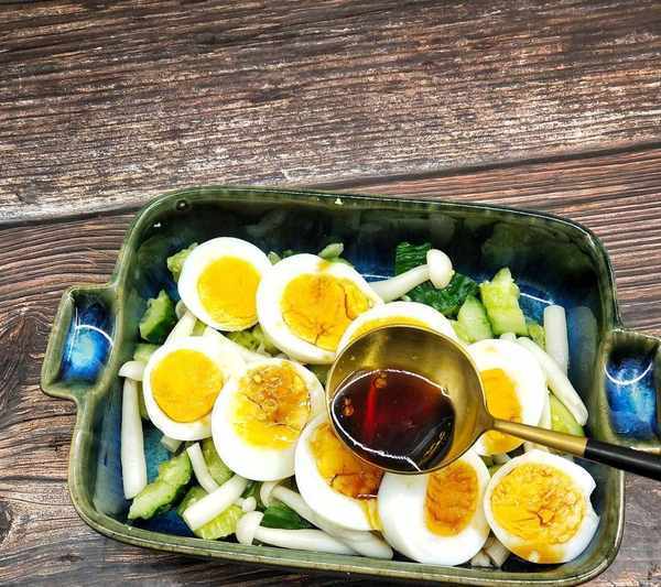 4、我一直覺得涼拌菜裡面有兩個雞蛋超級好吃,蛋黃不僅可以讓涼拌菜的料汁更加濃稠,還能增加鮮味,更主要的是,酸酸甜甜的涼拌料汁,可以讓本來無味的雞蛋變的超級好吃,所以大傢可以嘗試一下,在涼拌菜裡面加入一個雞蛋。