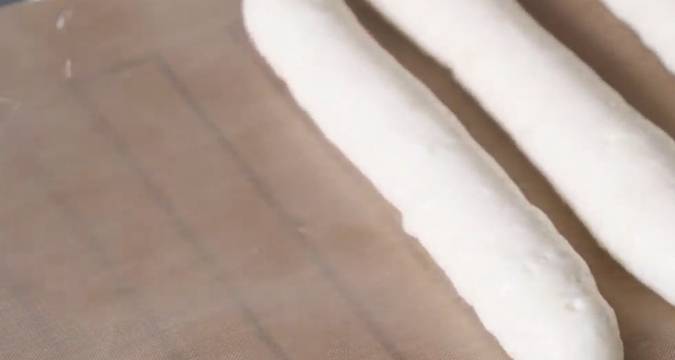 3.將翻拌好的面團裝進帶圓形裱花嘴的裱花袋裡,在烤盤上擠出長15厘米左右的長條形狀。