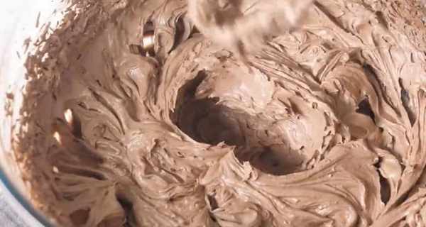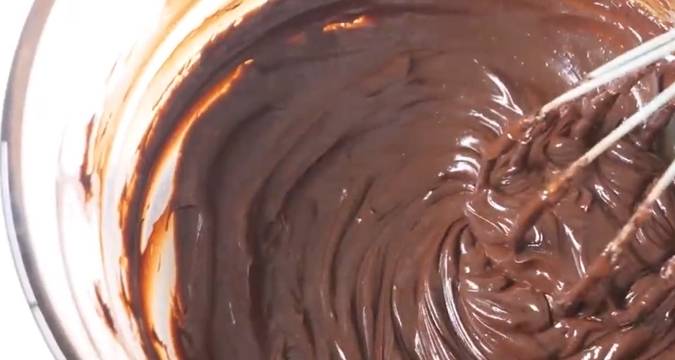8.將糖粉放入篩子裡過篩,放入巧克力混合物中,攪拌順滑。用電動打蛋器進行攪打,直至巧克力醬變得濃稠發白的狀態,代表巧克力奶油餡已經做好瞭。