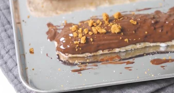5.將手指餅幹放涼後,就開始隔水融化巧克力,在餅幹表面用毛刷塗上一層巧克力,上面撒上裝飾,放置巧克力凝固。