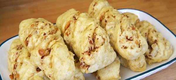 4、取出小劑子向外拉伸然後再反方向纏繞,花生花卷生胚就做好瞭,放入鍋中二次醒發20分鐘,使花卷的體積明顯變大,大火燒開,再轉小火蒸15分鐘,再燜5分鐘左右,燕麥花生卷就做好瞭。