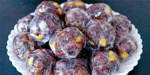 2、一碗紅棗清洗幹凈,去掉棗核,再剪成棗丁。粗糧蒸熟之後放涼,加一碗玉米粒,紅棗丁,葡萄幹,蔓越莓,適量白糖,攪拌均勻,再加一碗糯米粉攪拌均勻,抓一把用力攥成團,裹上一層幹糯米粉,再粘一層清水,再裹上一層糯米粉,一個生胚就做好瞭。