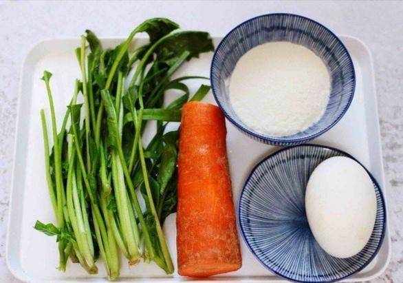 準備材料:鵝蛋1個(如果不喜歡吃鵝蛋,也可以用雞蛋來替代。)、菠菜100克、面粉30克、胡蘿卜1小個、花生油、鹽、雞精、花椒粉、料酒適量。