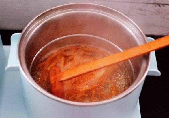 將湯鍋裡加入適量的清水,開火煮沸後,加入切絲的胡蘿卜焯一下水,撈出瀝幹。不需要換水,再把菠菜倒入鍋中焯一下水(菠菜特別容易熟,放入沸水後就可以撈出瞭。),焯過水的菠菜瀝幹水分後,用刀將其切碎。