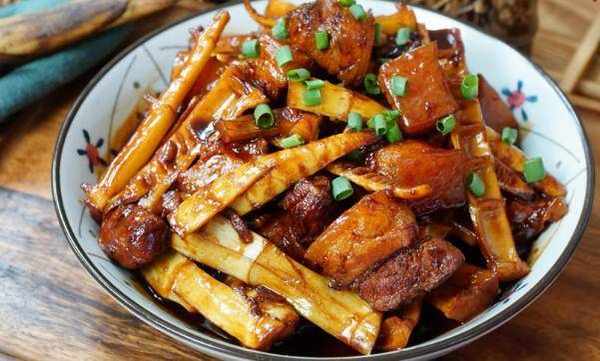 3.加3勺生抽,半勺老抽,1勺黃酒炒出醬香味。加淹過五花肉的開水,燜煮25分鐘至肉軟爛。春筍倒入鍋中,翻炒均勻,大火收汁即可。
