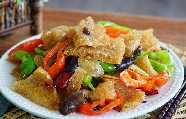 食材:皮肚、青紅辣椒各1個、木耳、大蒜、幹辣椒、蔥