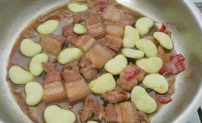2、將五花肉推至鍋中一旁,再利用幹煸出來的五花肉油脂爆香蔥段、蒜片、薑片、辣椒丁。加入<調味料>拌炒均勻,大火煮滾後,蓋上鍋蓋小火燜煮15~20分鐘。放入皇帝豆,繼續蓋鍋小火燜煮10~15分鐘至湯汁收幹即完成。