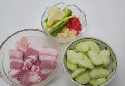 食材:皇帝豆100g、帶皮豬五花肉200g、青蔥1隻、蒜頭3瓣、薑片3片、辣椒1隻