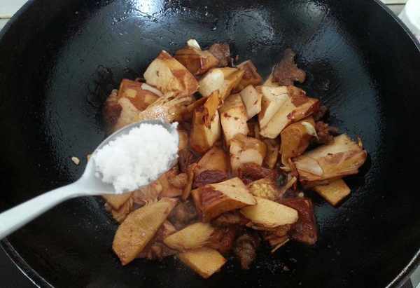 2、起鍋燒油,放入薑絲爆香,倒入肉片滑炒至變色,淋入料酒翻炒去腥。倒入春筍片翻炒一會兒,等到春筍變得焦黃後淋入老抽翻炒上色。
