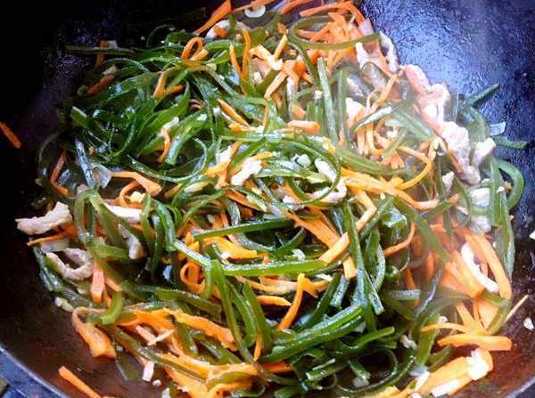 2、倒入胡蘿卜絲、海帶絲,加一勺米醋,大火翻炒2分鐘,海帶絲炒熟後加入適量食鹽、雞精、生抽調味,翻炒均勻即可出鍋。