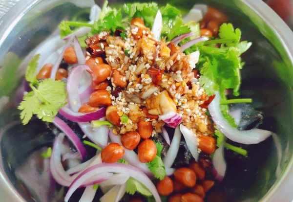 2、洋蔥去皮後切絲,香菜摘洗幹凈後切末。鍋裡加適量油,放入花生米,小火翻炒一會兒,炒熟後盛出放涼。把木耳、洋蔥絲、香菜段、熟花生米放在一起備用。