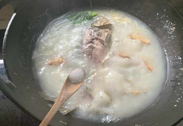 3、煮至魚湯濃白後放入豆腐塊、金針菇,加入適量食鹽調味,繼續燉10分鐘,等到金針菇熟透後加入白胡椒粉、蔥花,即可出鍋。