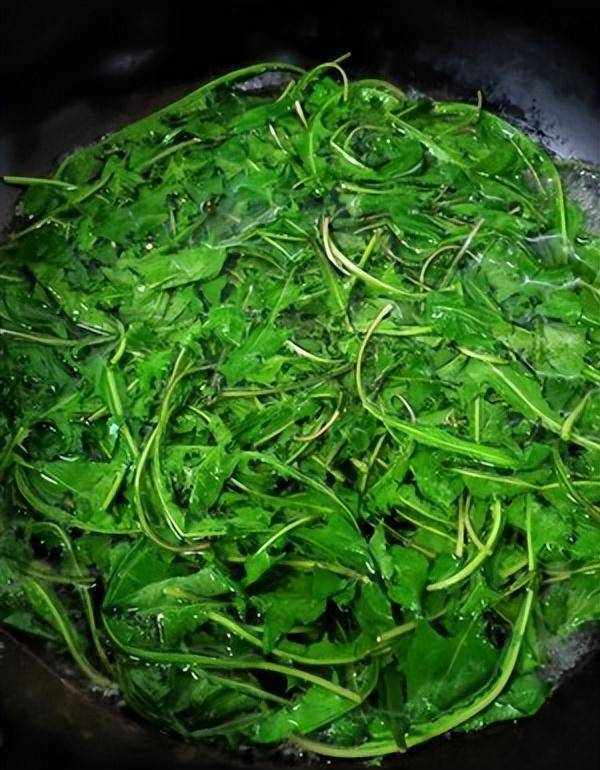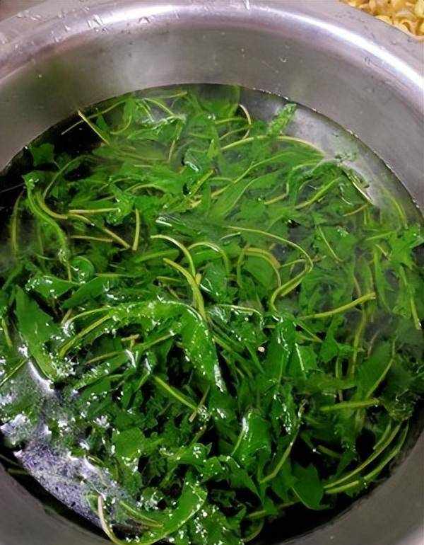 2、鍋裡水燒開,加幾滴油少許食鹽,鹽是為瞭讓蒲公英軟得更快,油是為瞭保持翠綠,水開後放蒲公英,等到燙軟後立馬撈出,不能煮久瞭,不然葉子容易爛掉。