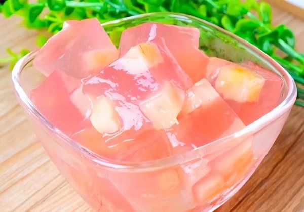 將果凍粉水倒入鍋中,繼續煮5分鐘,直到桃子軟化。