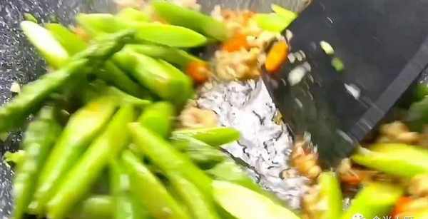 6、起鍋熱油,油燒熱以後先放入肉末,先把肉末慢慢的炒香,炒出豬油。肉末炒好以後,再倒入蔥薑蒜和小米椒,把蔥薑蒜炒出香味,炒香以後再倒入蘆筍,淋入調好的醬汁,然後再快速的翻炒十幾下,讓蘆筍入味就可以出鍋裝盤。