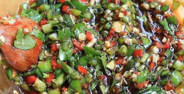 2、再來準備一些調料,青紅椒切碎,喜歡吃辣的可以加一些小米辣進去,再切一些蒜末,搭配一些蔥花香菜。全部裝入碗中。加入食用鹽、生抽。白醋攪拌均勻。再淋入一些香油,調料就做好瞭。