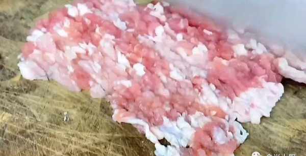 3、接著再準備一小塊五花肉,先把肉皮切掉,肉皮的口感也比較硬,而且腥味比較重,最後再把五花肉剁成肉末。
