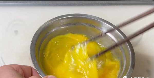 再來兩個雞蛋,單手打入碗中,用筷子攪拌均勻,材料全部備好。
