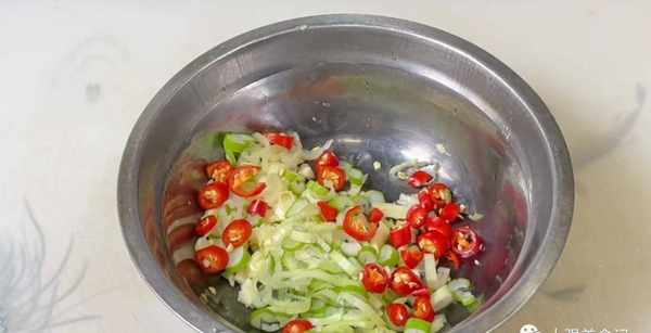 接下來準備一點小料,兩三粒大蒜,拍碎剁碎。再來少許蔥花。小米辣,不能吃辣的可以不放,切成小圈,切好以後全部放入碗中備用,
