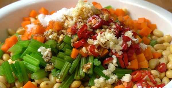 再把切好的胡蘿卜丁也放進開水裡,同樣的方法燒水一分鐘,撈出來控水備用。控幹水的芹菜切成長段,放到裝黃豆的大碗裡,胡蘿卜丁也倒進來,加入蒜末和紅椒圈,適量的鹽,一點白糖提鮮,兩大勺生抽,一勺香醋,一勺蒸魚豉油,先用勺子把食材充分攪拌一下,