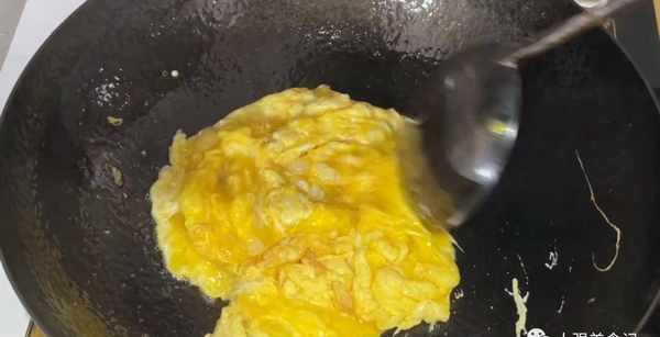 另起鍋,燒至冒煙以後,放入一小勺油,油熱以後放入打好的蛋液,炒雞蛋時油溫稍微高一點,這樣炒出來更香更好吃。炒熟炒散懟成大塊兒,炒好以後倒出控油。
