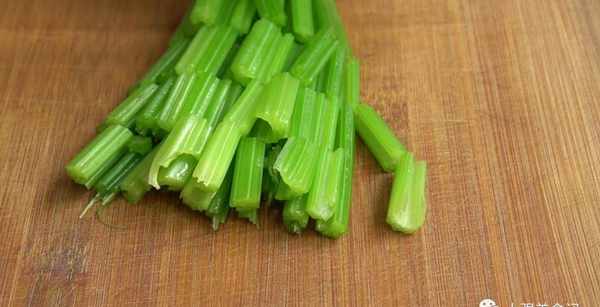另準備一鍋開水,加勺鹽,攪拌均勻。先讓鹽化開,然後倒入一把提前洗幹凈的芹菜,焯水一分鐘,等芹菜斷生就行瞭,撈出來過一下涼開水,控水備用,