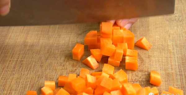 如果想要更綿軟的口感,可以再增加五分鐘。準備一根胡蘿卜,先切厚片,切條,再切成小丁。