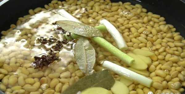 把浸泡的水過濾掉,黃豆直接倒進鍋裡,加入能沒過黃豆的清水,一小把花椒粒、幾個八角、幾片香葉,還有蔥段和薑片,適量的鹽調味,攪拌均勻以後,蓋上蓋子,大火燒開,轉小火煮20分鐘,把黃豆完全煮熟。