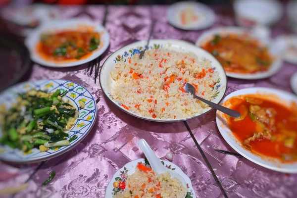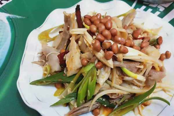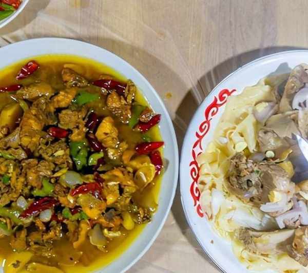大盤雞:土雞剁塊,焯水去血沫雜質,各種佐料炸香後開水燉煮。再加入青椒、土豆、胡蘿卜、幹辣椒、翻炒後出鍋。色彩鮮艷、爽滑麻辣的雞肉和軟糯甜潤的土豆,辣中有香。記得在南疆杏花村的時候,隻帶瞭一些羊肉和素菜,就麻煩當地民宿主人傢現抓一隻雞宰殺之後做大盤雞。這種散養的公雞比養殖場批量生產出的仔雞味道不要好太多!