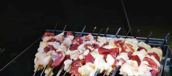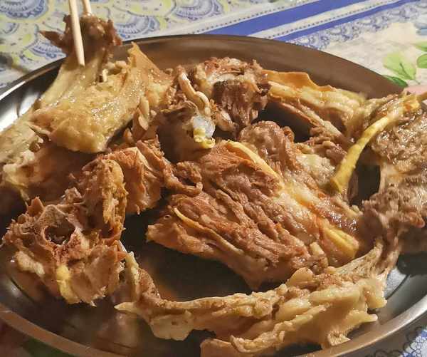 烤羊肉串:羊後腿肉最佳,切3*0.6厘米塊(7-8塊肥瘦相間),先用雞蛋、洋蔥(捏碎,為瞭去除膻味,讓肉質更加鮮嫩)、鹽、西紅柿、辣椒進行醃制,然後穿串放到炭火上文火烤,如果油低落火起可以撒鹽或者灑水,在烤制過程中撒孜然、辣椒粉調料粉。烤出的羊肉串外焦裡嫩,吃到嘴裡油香四溢,一點都沒有羊肉的膻味。好的食材不做任何特別的加工就可以出來自然的味道。