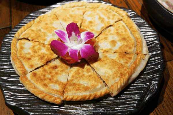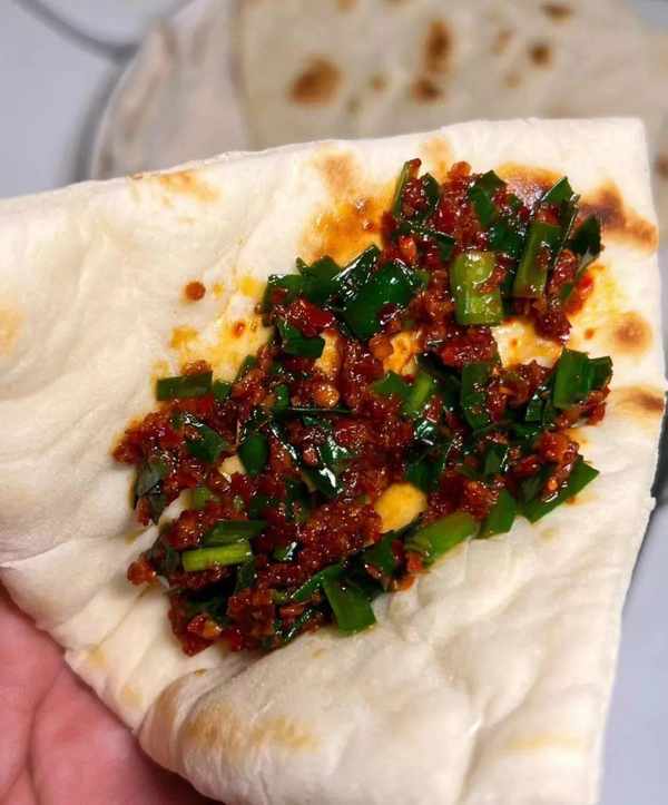 加入切碎的羊肉丁、鹽、孜然粉、胡椒粉、洋蔥末等佐料烤制而成。