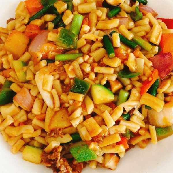 在新疆餐廳點餐,光面食類菜單都會看很久,因為新疆炒面的種類真的很多繁多,如丁丁炒面、新疆炒拉條子面、新疆炒面片、二節子炒面、幹煸炒面等,一般都使用高筋面粉,所以面條都很勁道且有嚼勁。