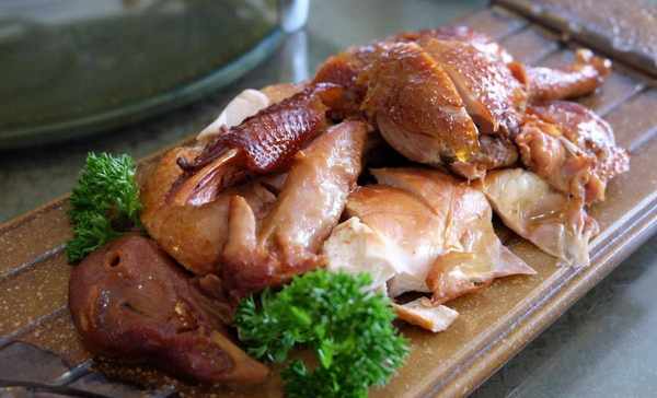 溝幫子熏雞的做法非常的繁瑣,煮雞的時候掌握好火候,還要使雞軟爛不散,同時也要保證雞的完整,外觀也要好,不能因為熏制時間過長,而影響瞭雞的外觀。