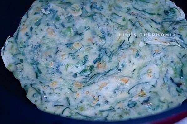 6、取平底不粘鍋,鍋中刷薄油,預熱。倒入適量面糊攤平鍋底,中小火煎至雙面焦黃即可。
