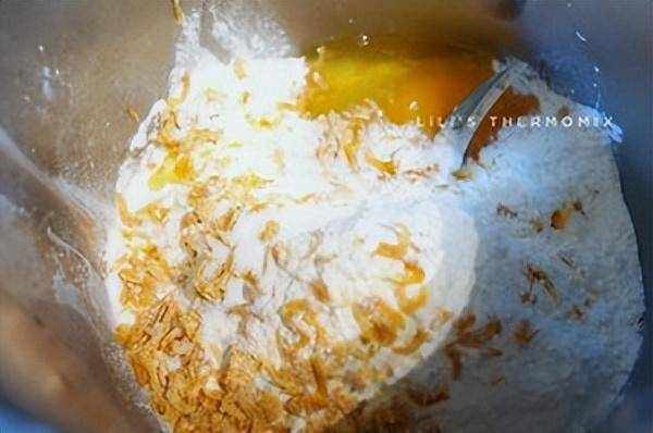 4、主鍋放入250克面粉,10克蝦皮、3克匙鹽、5克糖、1個雞蛋,270克清水,設置15秒/速度3混合,水量根據面粉吸水性增減,濃稠流動狀態即可!