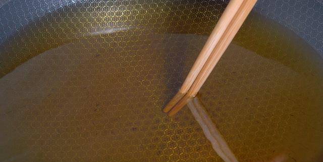 8.起鍋燒油,開大火把油溫升高。燒到鍋底開始冒泡轉小火。