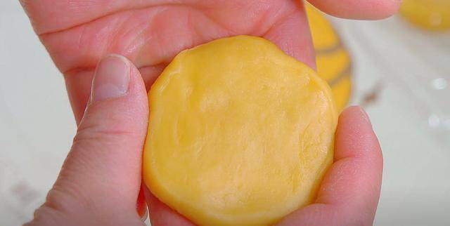 6.不需要整形,把它放到手掌心,稍微按捏一下,捏成小餅狀。想吃大個頭的話就分大一點。