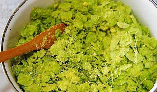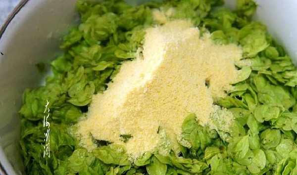 不用水,不加鹽,直接將將玉米面倒入榆樹錢中。