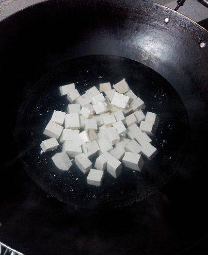 鍋裡燒水,開鍋後加點鹽,放入豆腐焯一焯,連鍋端,倒在篩子裡瀝水。用舀的怕把豆腐弄碎。若是吃得比較淡或咸蛋夠咸,就不要放鹽瞭哇。