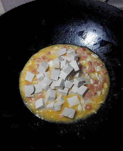 鍋子熱一熱,放食用油,平時炒菜的量,放咸蛋進去炒出黃油後倒入火腿腸,翻炒均勻。