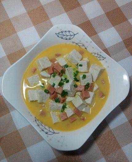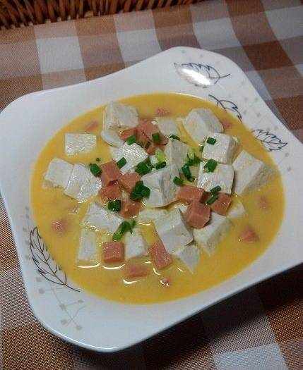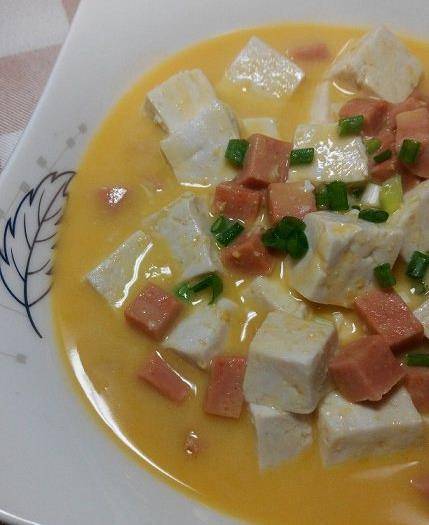 豆腐的又一種吃法來啦,咸蛋燒豆腐很簡單很方便很快捷,犯懶的時候我就這麼做(貌似我經常犯懶...)。需要用到的材料有:豆腐(跟老板說要嫩的,要吃煎的就說要老的,我每次都這樣買),咸蛋,火腿腸,小蔥。調味的就是來點水淀粉,鹽。