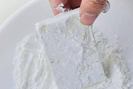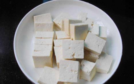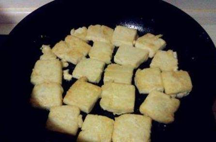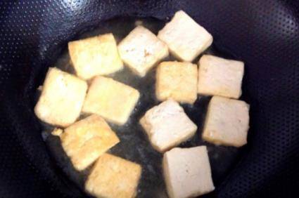 豆腐切塊,沾上淀粉,放油鍋內煎。
