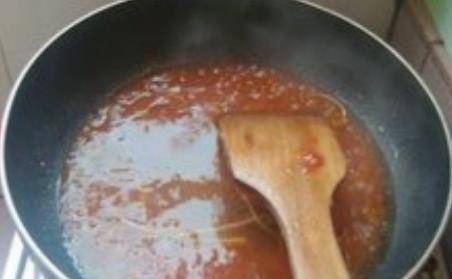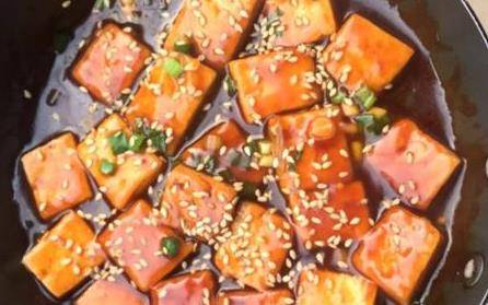 鍋內留底油,倒入調好的糖醋汁,燒到冒泡泡,倒入炸好的豆腐,快速翻動使每一片都均勻的裹上汁。