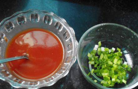 提前調糖醋汁(糖醋汁:番茄醬,糖,少量醋,蠔油,加少量水調勻),蔥切末備用。