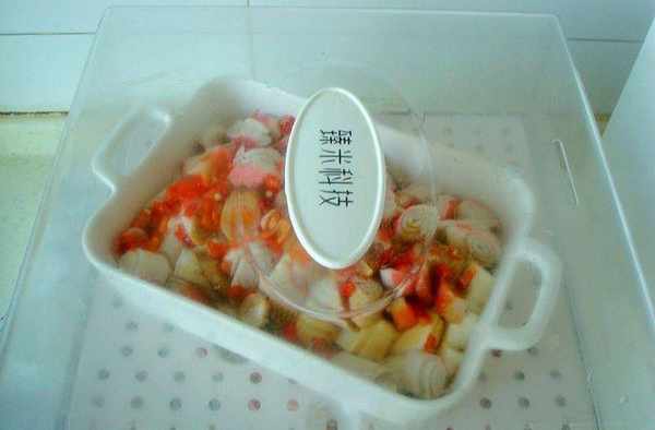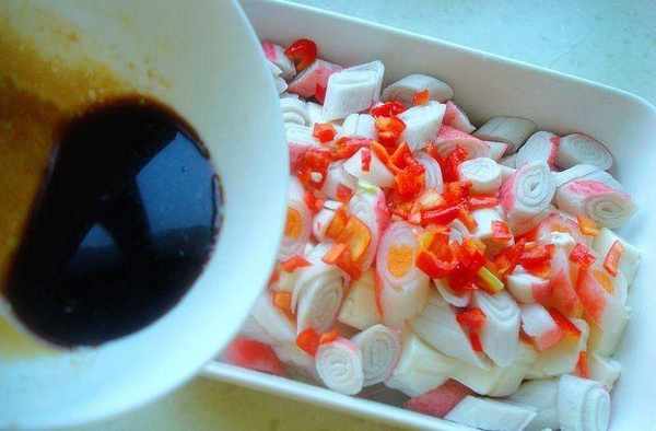 4、蟹肉棒、辣椒圈一起均勻的撒在豆腐上。淋上調好的料汁。用保鮮膜蓋住,用牙簽紮幾個口,這樣便於排氣。